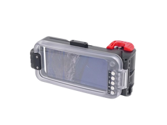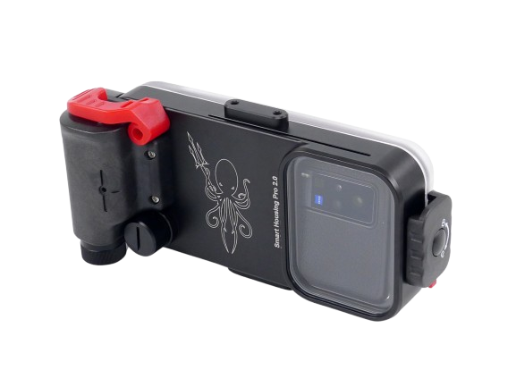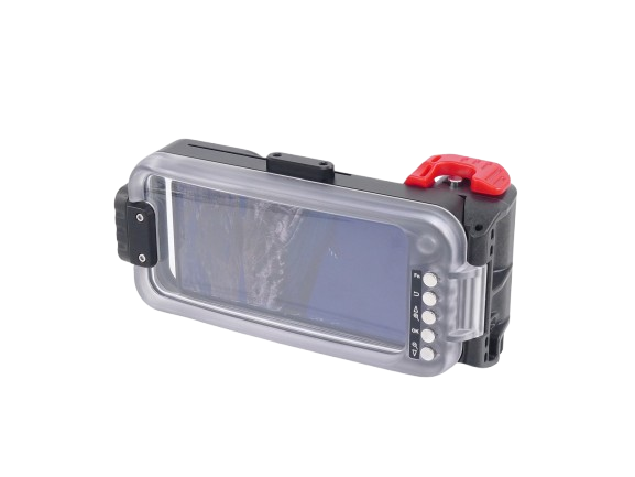 It’s finally here…the latest version of our popular universal smart phone housing! Many small updates bring our Smart Housing V2.0 up to date to be able to fit most phones on the market, large and small. We’ve redesigned the electronics to better protect them from water accidentally dripping inside. The housing is now powered by an 18650 Lithium ion battery that will ALSO charge your phone while it’s in the case (small custom charging cables included). The Smart Housing V2.0 still includes a vacuum port to ensure your device is safe inside before you get in the water and an accessory track built in for an optional sliding red filter. Depth rated to 280′.